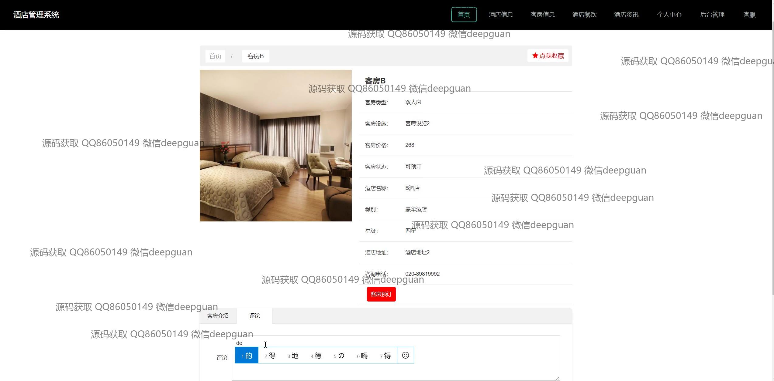 19 | 前台: 主要提供用户和客户账户创建、信息输入、预订和订购酒店服务的界面。用户登录和注册功能确保访问权限和信息安全。前台展示各种模块的基础信息,包括酒店资讯、客房详情、餐饮服务,通过互动界面提高用户体验,引导用户进行有效的操作和管理。