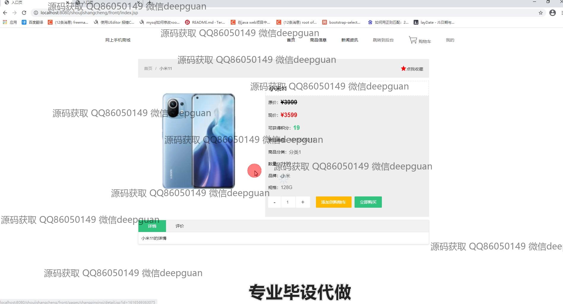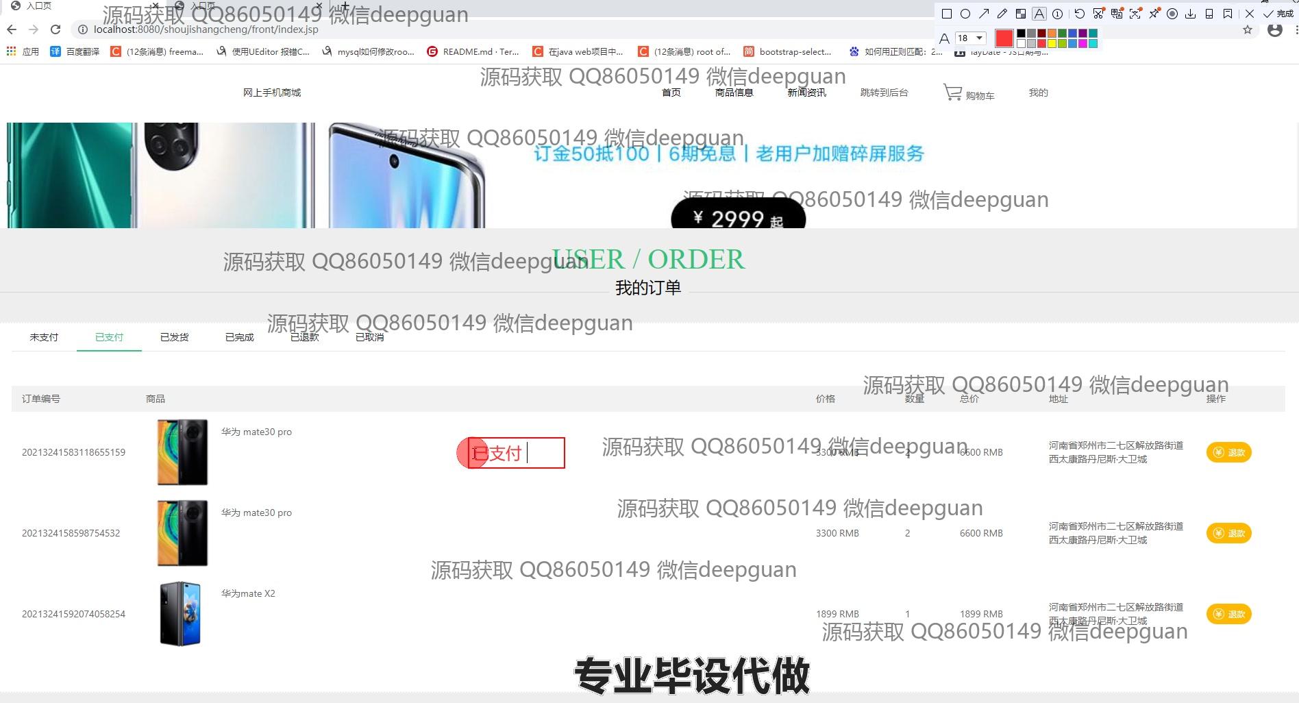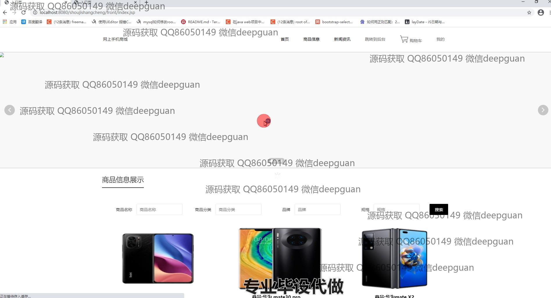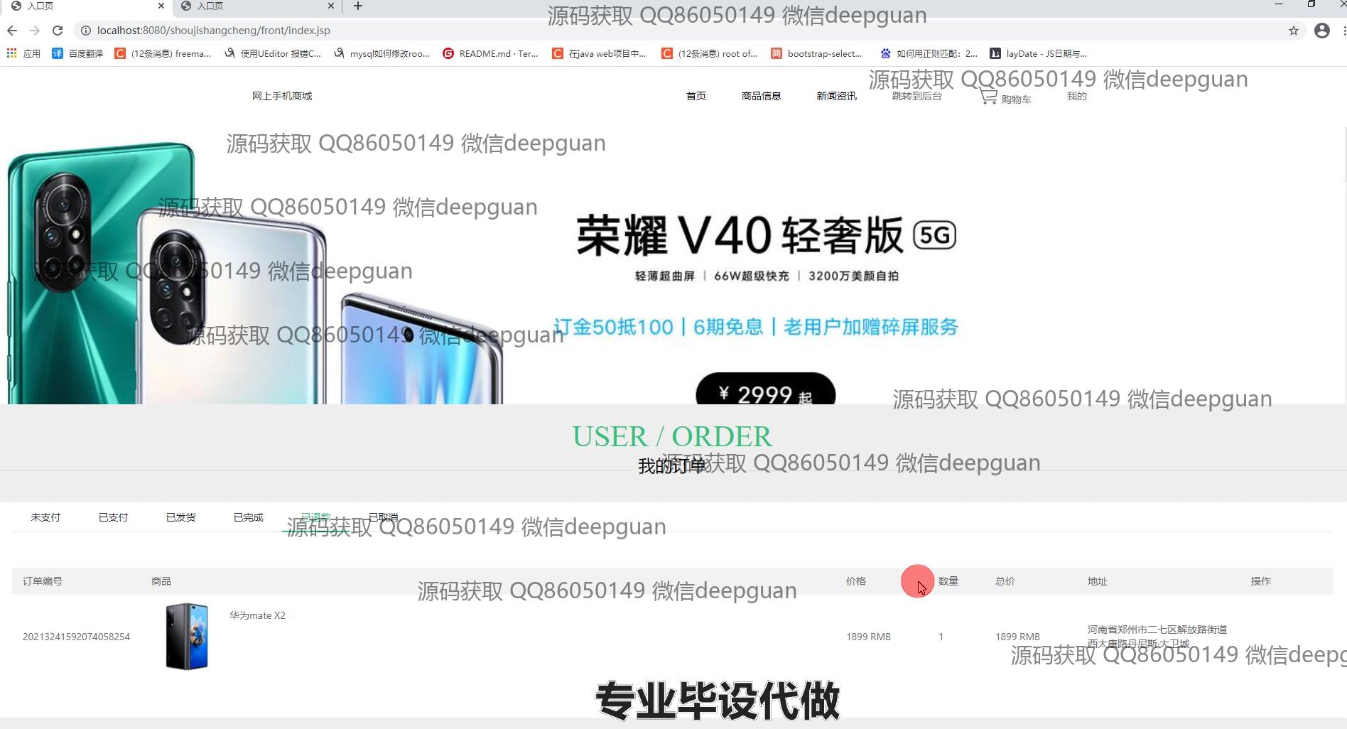 4 | 基于JSP的网上手机商城:提供用户管理、商品分类与信息管理、订单管理、轮播图管理、商品收藏、购物车、个人中心等功能,支持用户信息修改、商品上下架、订单状态查看及管理。 --计算机毕业设计源码;毕设源码;java毕业设计源码