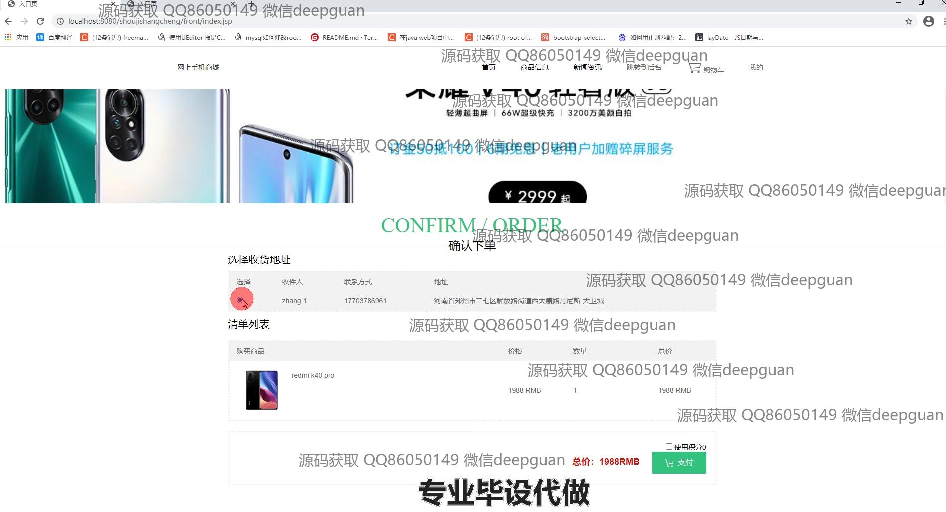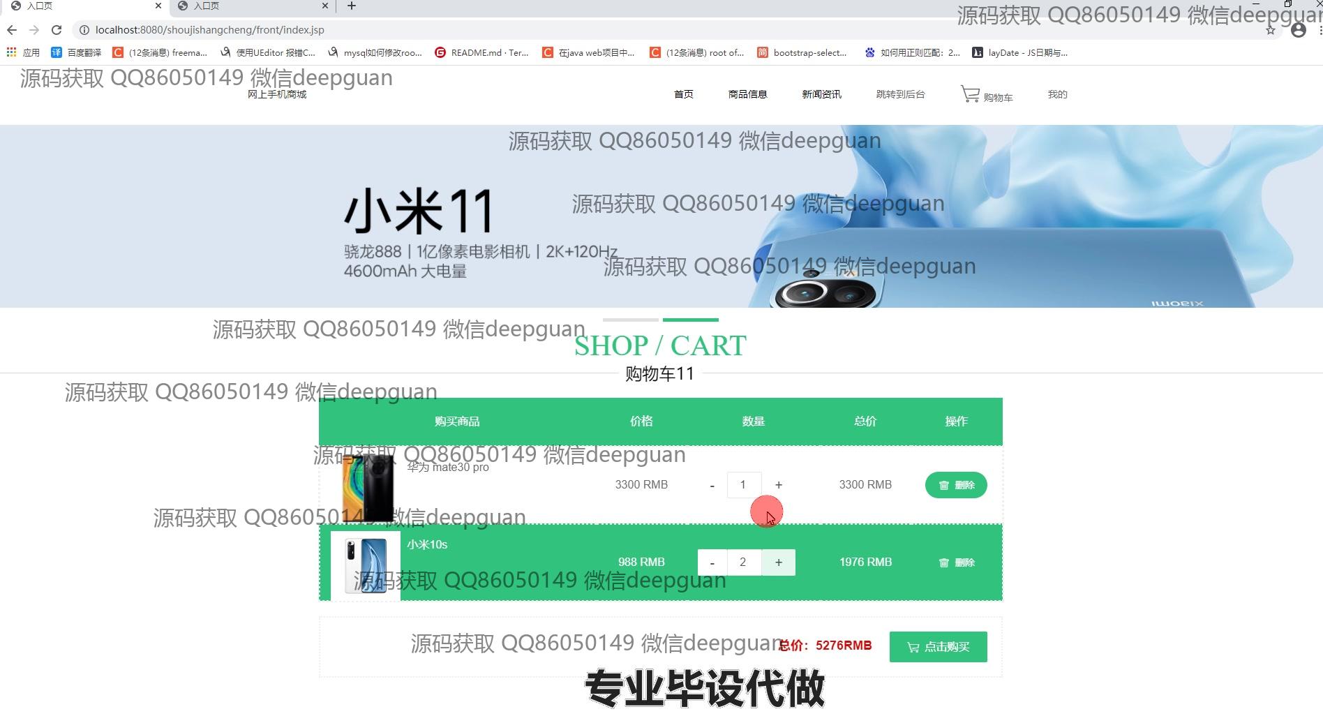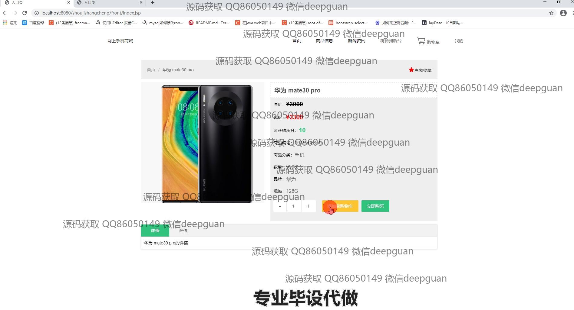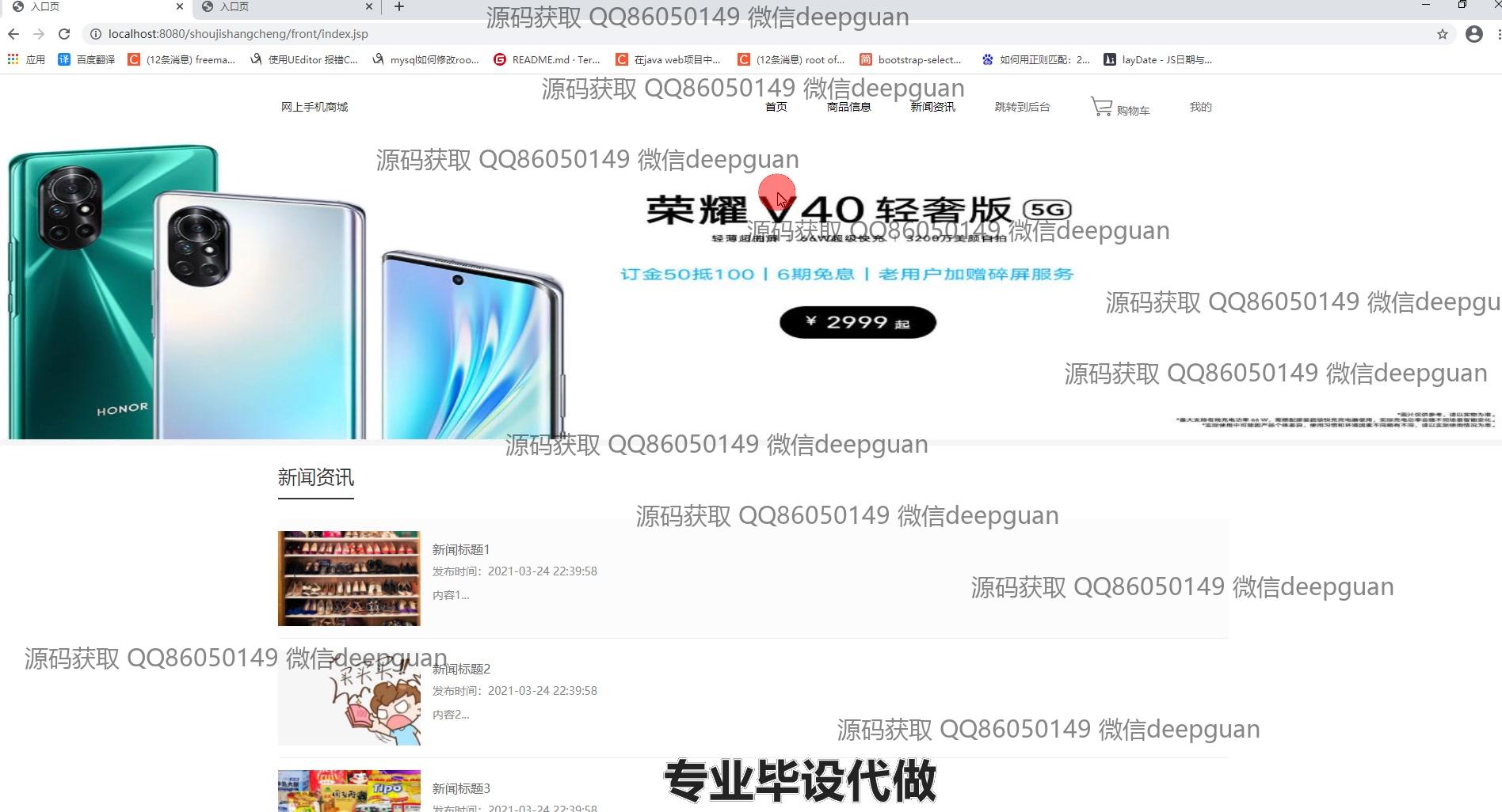 4 | 基于JSP的网上手机商城:提供用户管理、商品分类与信息管理、订单管理、轮播图管理、商品收藏、购物车、个人中心等功能,支持用户信息修改、商品上下架、订单状态查看及管理。 --计算机毕业设计源码;毕设源码;java毕业设计源码