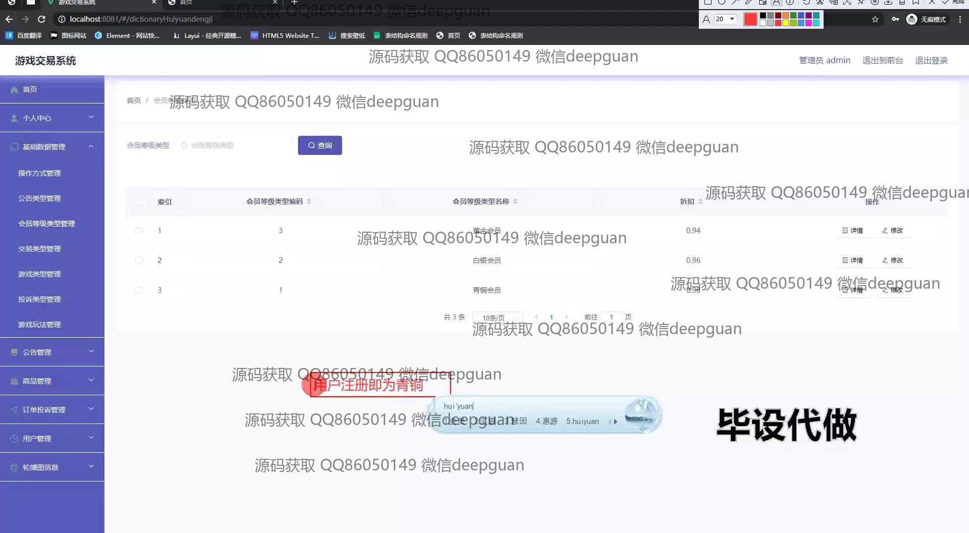 4 | 游戏交易系统:角色分为管理员、用户;功能包括商品展示、订单管理、用户管理、公告管理、会员等级管理等,支持充值及支付操作,提供投诉处理及交易评价功能,界面简洁,提高用户体验。 --计算机毕业设计源码;毕设源码;java毕业设计源码