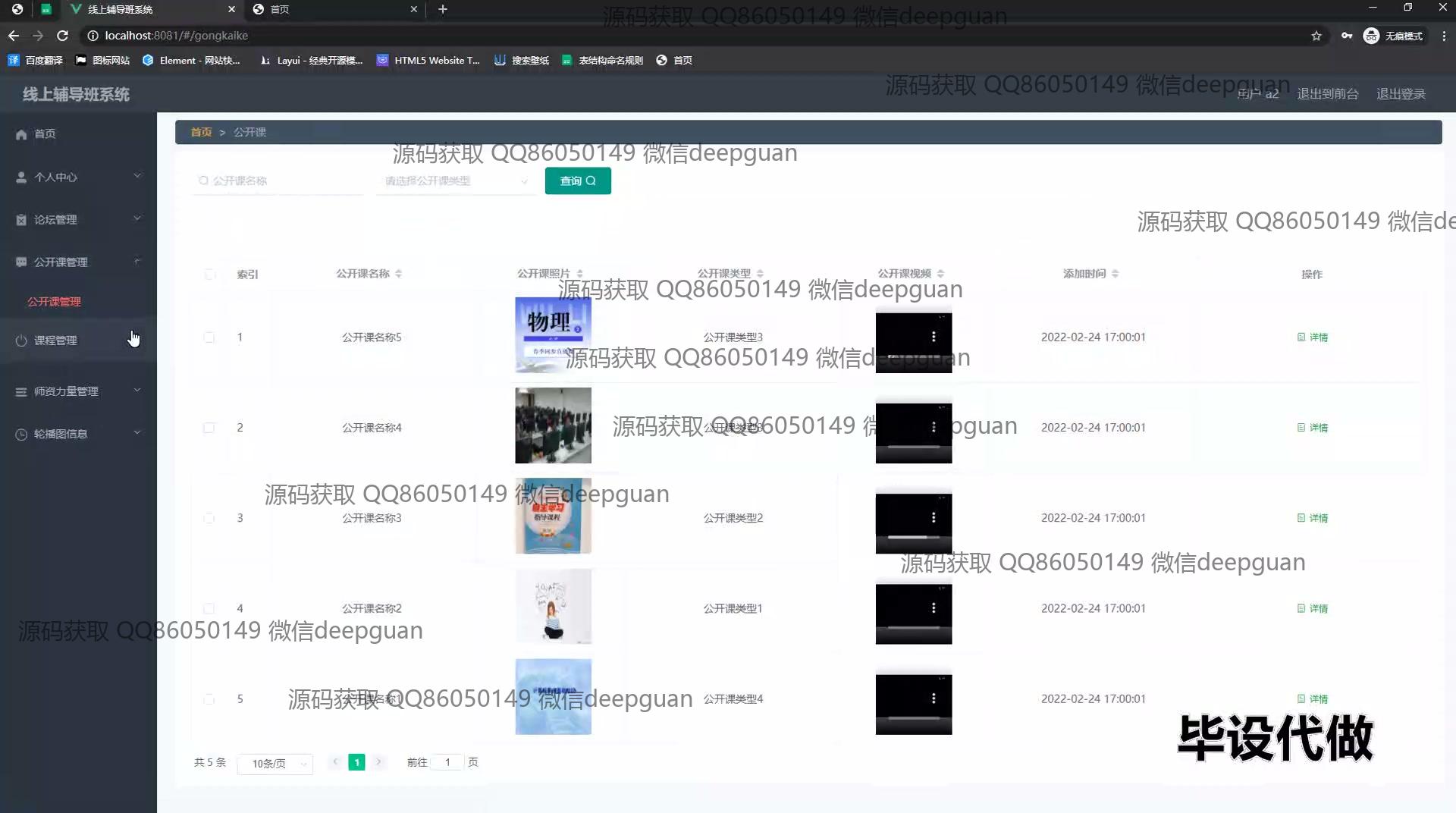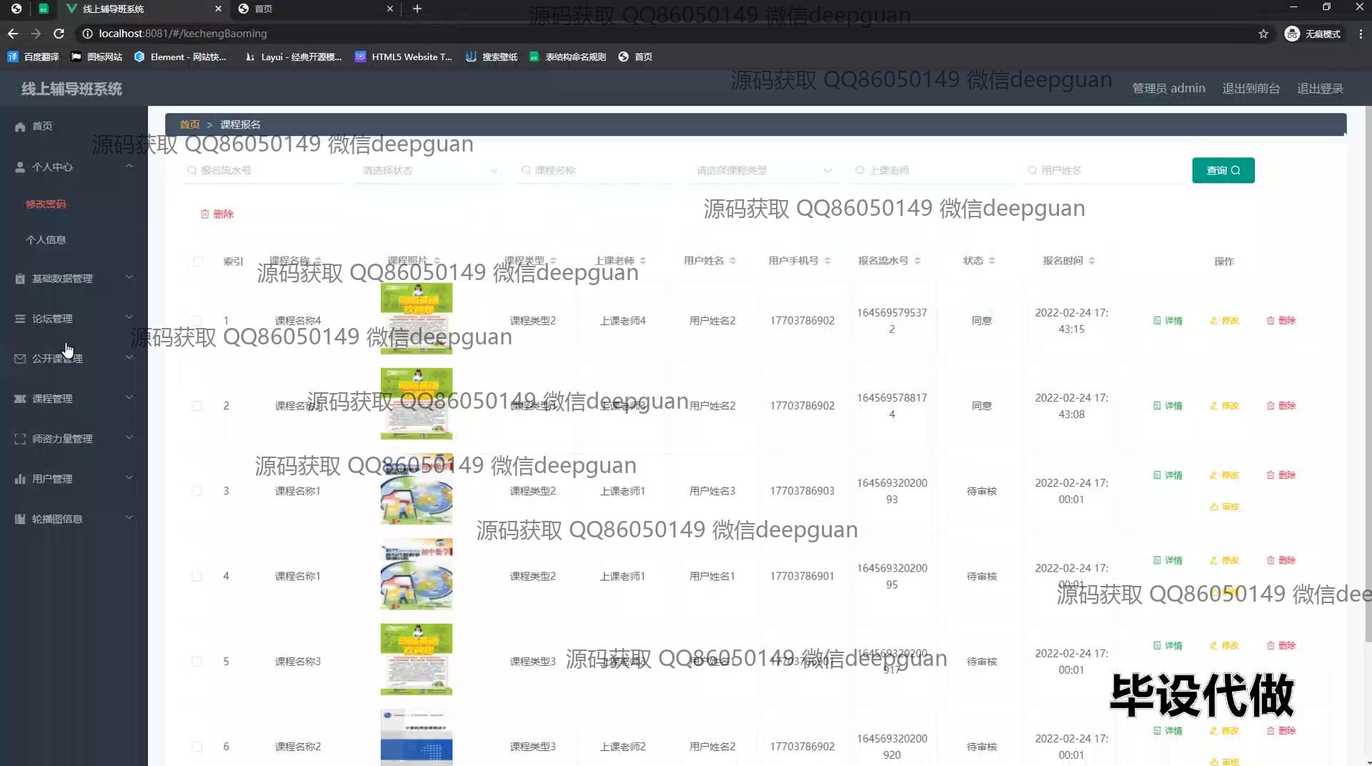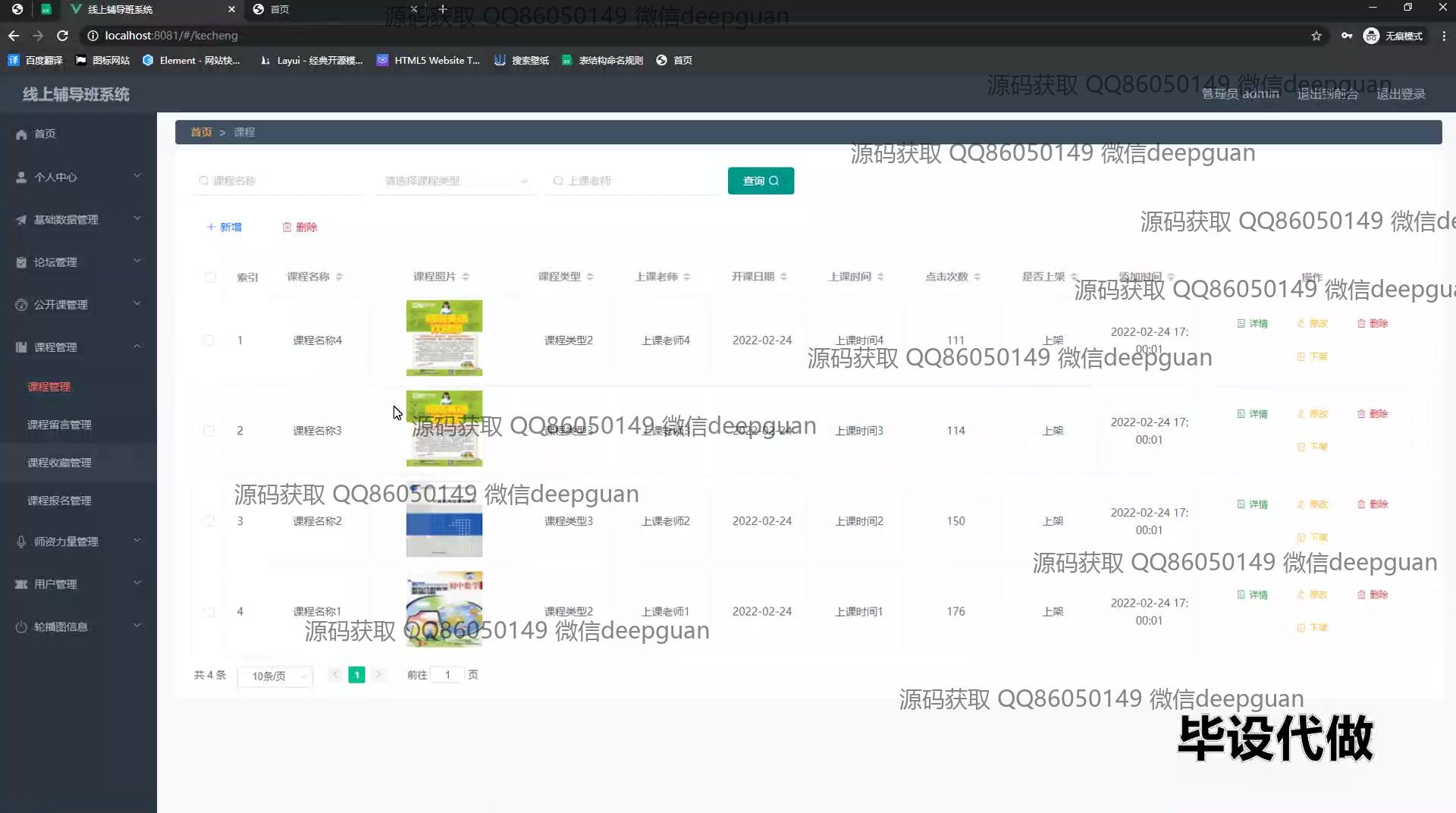 4 | 线上辅导班系统:角色分为管理员、用户;功能包括用户登录、课程管理、教师信息管理、论坛互动、在线咨询、后台管理,支持用户信息更新及互动,便捷管理线上学习资源。 --计算机毕业设计源码;毕设源码;java毕业设计源码