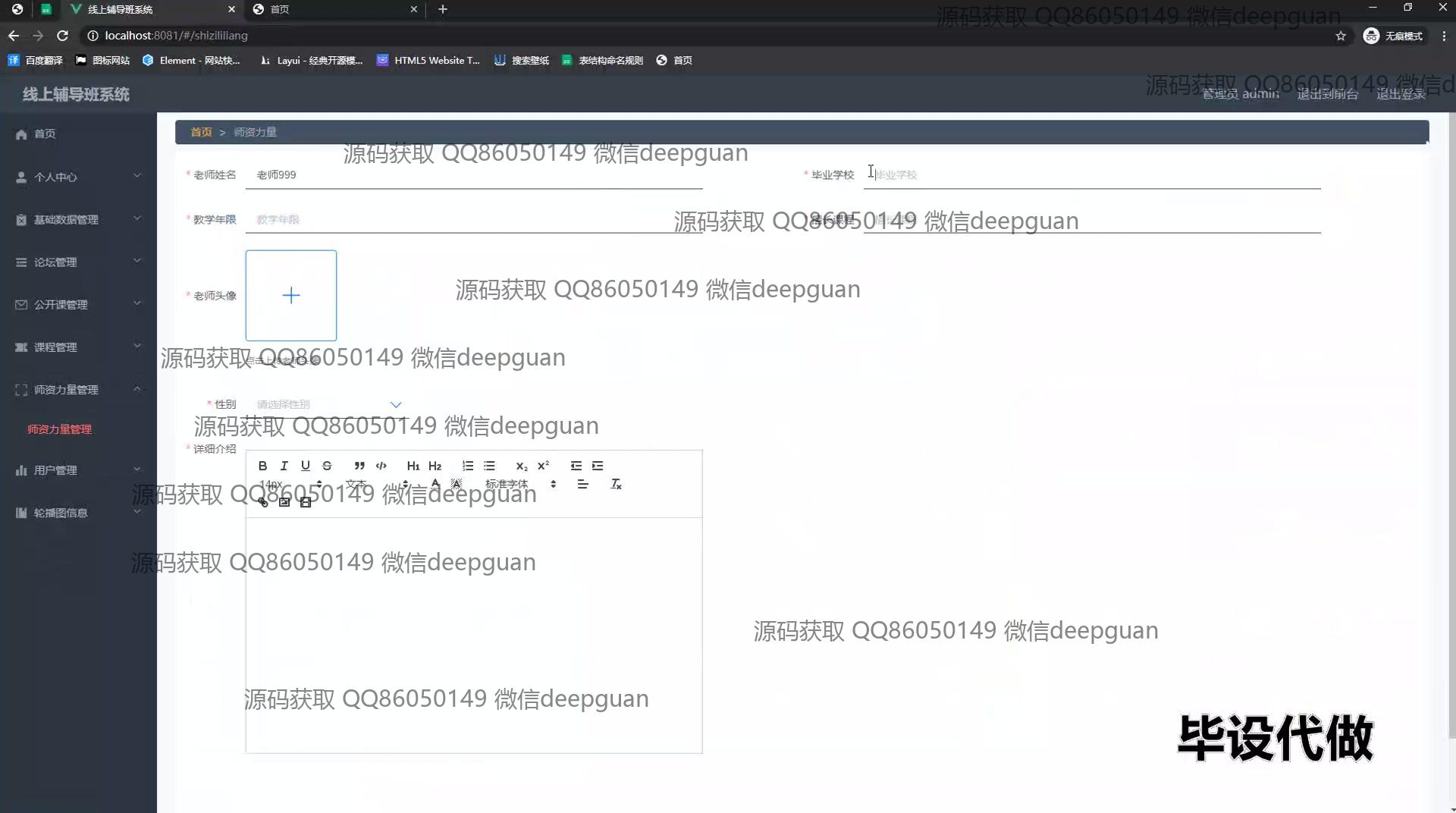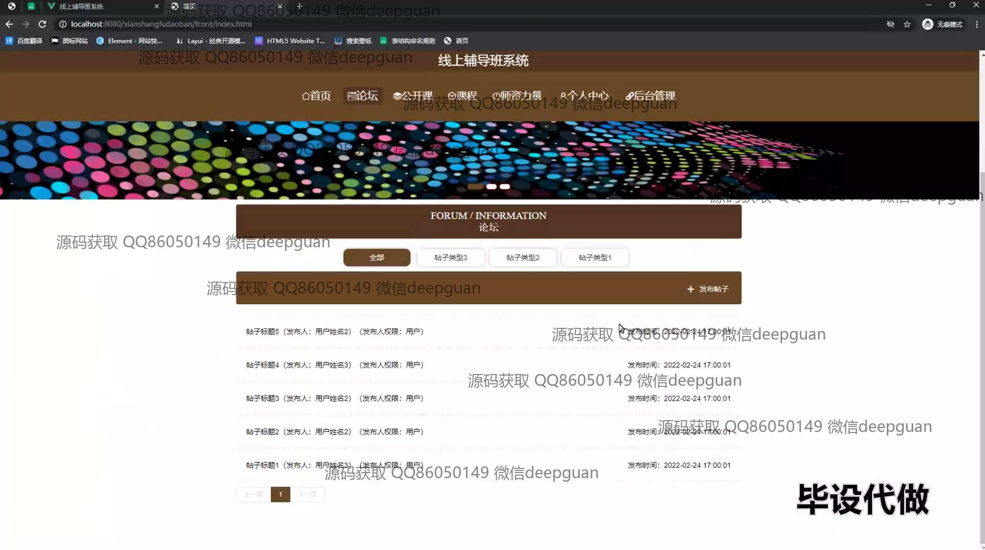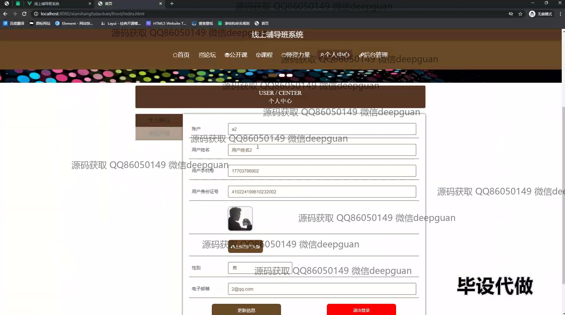 4 | 线上辅导班系统:角色分为管理员、用户;功能包括用户登录、课程管理、教师信息管理、论坛互动、在线咨询、后台管理,支持用户信息更新及互动,便捷管理线上学习资源。 --计算机毕业设计源码;毕设源码;java毕业设计源码