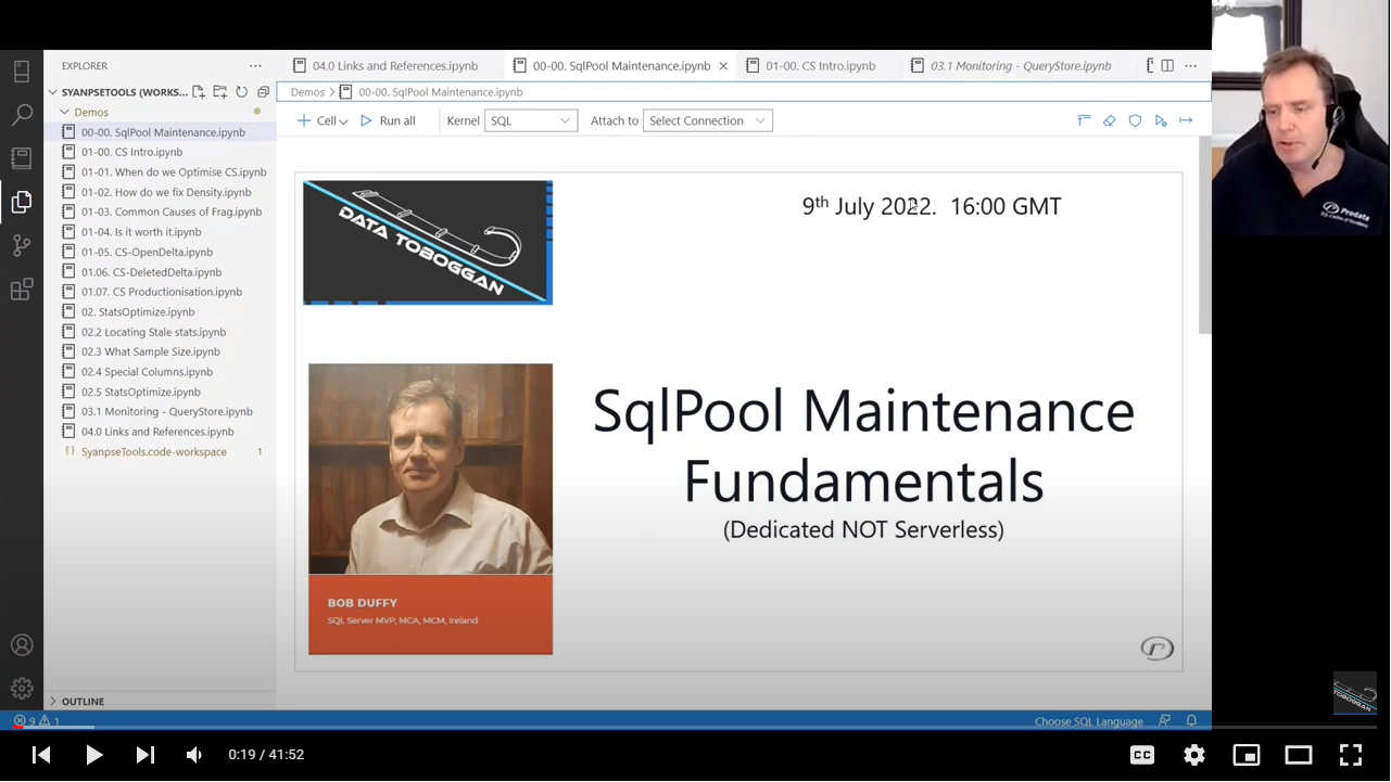 " 402 | }, 403 | "metadata": {} 404 | } 405 | ], 406 | "execution_count": 6 407 | }, 408 | { 409 | "cell_type": "markdown", 410 | "source": [ 411 | "Rather than \"per stats\" we track meta data per table due  to the limitations in DMVs in the SqlPool. Sample View provided by Prodata below. This provides some critcal information\n", 412 | "\n", 413 | "- stats\\_row\\_count. This is the number of estimated rows when the stats were last rebuilt. Using DMV pdw\\_table\\_distribution\\_properties  \n", 414 | "- actual\\_row\\_count. This is the actual number of rows using the DMV sys.dm\\_pdw\\_nodes\\_db\\_partition\\_stats\n", 415 | "- dynamic\\_threshold\\_row. recommended threshold to update stats using same algorithm(s) as traditonal SQL Server. The lower of 20% difference or   SQRT(1000 \\* \\[row count\\])." 416 | ], 417 | "metadata": { 418 | "azdata_cell_guid": "1cb98a6a-2d3a-49d4-8a8c-5fb1286dae7d" 419 | }, 420 | "attachments": {} 421 | } 422 | ] 423 | } -------------------------------------------------------------------------------- /SqlPools/Demos/04.0 Links and References.ipynb: -------------------------------------------------------------------------------- 1 | { 2 | "metadata": { 3 | "kernelspec": { 4 | "name": "SQL", 5 | "display_name": "SQL", 6 | "language": "sql" 7 | }, 8 | "language_info": { 9 | "name": "sql", 10 | "version": "" 11 | }, 12 | "extensions": { 13 | "azuredatastudio": { 14 | "version": 1, 15 | "views": [] 16 | } 17 | } 18 | }, 19 | "nbformat_minor": 2, 20 | "nbformat": 4, 21 | "cells": [ 22 | { 23 | "cell_type": "markdown", 24 | "source": [ 25 | "# Links and References\n", 26 | "\n", 27 | " \n", 28 | "\n", 29 | "Columnstore References\n", 34 | "\n", 35 | "Microsoft Docs on SQL Pool Indexing with sample code on density\n", 40 | "\n", 41 | "https://docs.microsoft.com/en-us/azure/synapse-analytics/sql-data-warehouse/sql-data-warehouse-tables-index\n", 46 | "\n", 47 | "and sample code for maintenance is here\n", 52 | "\n", 53 | "https://github.com/rgl/azure-content/blob/master/articles/sql-data-warehouse/sql-data-warehouse-manage-columnstore-indexes.md\n", 58 | "\n", 59 | "Improving Columnstore indexes in dedicated SQL Pool\n", 64 | "\n", 65 | "https://docs.microsoft.com/en-us/azure/synapse-analytics/sql-data-warehouse/sql-data-warehouse-memory-optimizations-for-columnstore-compression\n", 70 | "\n", 71 | "Columnstore Index Defragmentation using REORGANIZE Command\n", 76 | "\n", 77 | "https://docs.microsoft.com/en-gb/archive/blogs/sqlserverstorageengine/columnstore-index-defragmentation-using-reorganize-command\n", 82 | "\n", 83 | "Performance tuning with ordered clustered columnstore index\n", 98 | "\n", 99 | "https://docs.microsoft.com/en-us/azure/synapse-analytics/sql-data-warehouse/performance-tuning-ordered-cci\n", 104 | "\n", 105 | "Ordered columns store alignment code\n", 110 | "\n", 111 | "https://github.com/NikoNeugebauer/CISL/blob/master/SQL%20DW/alignment.sql\n", 116 | "\n", 117 | "MSFT - Indexing dedicated SQL pool tables in Azure synapse Analytics\n", 122 | "\n", 123 | "https://docs.microsoft.com/en-us/azure/synapse-analytics/sql-data-warehouse/sql-data-warehouse-tables-index" 128 | ], 129 | "metadata": { 130 | "azdata_cell_guid": "3b257ac1-361e-4815-a61f-5748da07fd6d" 131 | }, 132 | "attachments": {} 133 | }, 134 | { 135 | "cell_type": "markdown", 136 | "source": [ 137 | "Statistics References\n", 143 | "\n", 144 | "Create and update statistics on tables - Azure Synapse Analytics | Microsoft Docs\n", 151 | "\n", 152 | "https://docs.microsoft.com/en-us/azure/synapse-analytics/sql-data-warehouse/sql-data-warehouse-tables-statistics\n", 158 | "\n", 159 | "Statistics in Synapse SQL. General best practise and starting point.\n", 166 | "\n", 167 | "https://docs.microsoft.com/en-us/azure/synapse-analytics/sql/develop-tables-statistics\n", 173 | "\n", 174 | "General SQL Statistics (Critical document in understanding update threshold like SQRT (SQRT(1,000 *  n) )\n", 191 | "\n", 192 | "https://docs.microsoft.com/en-us/sql/relational-databases/statistics/statistics?view=sql-server-2017\n", 198 | "\n", 199 | "Ola Hallengren Maintenance Framework. The de-facto industry standard for MSQL maintenance on SMP> while it does not support Synapse SQL, it gives great example of concept, standards and syntax.\n", 206 | "\n", 207 | "https://ola.hallengren.com/\n", 213 | "\n", 214 | "Series by Erin from SqlSkills on basics of Stats maintenance using Ola Hallengren scripts and background on thresholds\n", 221 | "\n", 222 | "https://www.sqlskills.com/blogs/erin/updating-statistics-with-ola-hallengrens-script/\n", 228 | "\n", 229 | "https://www.sqlskills.com/blogs/tim/when-updating-statistics-is-too-expensive/\n", 235 | "\n", 236 | "Extended Sample source code for locating stale rows “per table” based on original MS GitHub. We use this a lot in combination with Ola Hallengren syntax and standards.\n", 243 | "\n", 244 | "https://github.com/abrahams1/Azure_Synapse_Toolbox/tree/master/SQL_Queries/Statistics\n", 250 | "\n", 251 | "Microsoft Samples SQLOPS procedures on GitHub for detecting data skew. The query here forms the basis of our maintenance framework in comparing estimated rows to actual rows within partition stats\n", 258 | "\n", 259 | "https://github.com/Microsoft/sql-data-warehouse-samples/blob/main/samples/sqlops/MonitoringScripts/ImpactedTables" 265 | ], 266 | "metadata": { 267 | "azdata_cell_guid": "8e5ebc8a-8fc6-4038-b0e5-67e60262c6dd" 268 | }, 269 | "attachments": {} 270 | }, 271 | { 272 | "cell_type": "markdown", 273 | "source": [ 274 | "## Blogs and GitHub\n", 275 | "https://prodata.ie/2021/08/28/do-we-need-to-maintain-columnstores-in-sql-pools/\n", 276 | "https://prodata.ie/2021/08/12/finding-outdated-and-missing-stats-in-synapse-sql-pools/\n", 277 | "\n", 278 | "https://github.com/ProdataSQL/SynapseTools/tree/main/SqlPools/Maintenance\n", 279 | "" 280 | ], 281 | "metadata": { 282 | "azdata_cell_guid": "2cb54686-038e-4d3b-a977-adccb5683f58" 