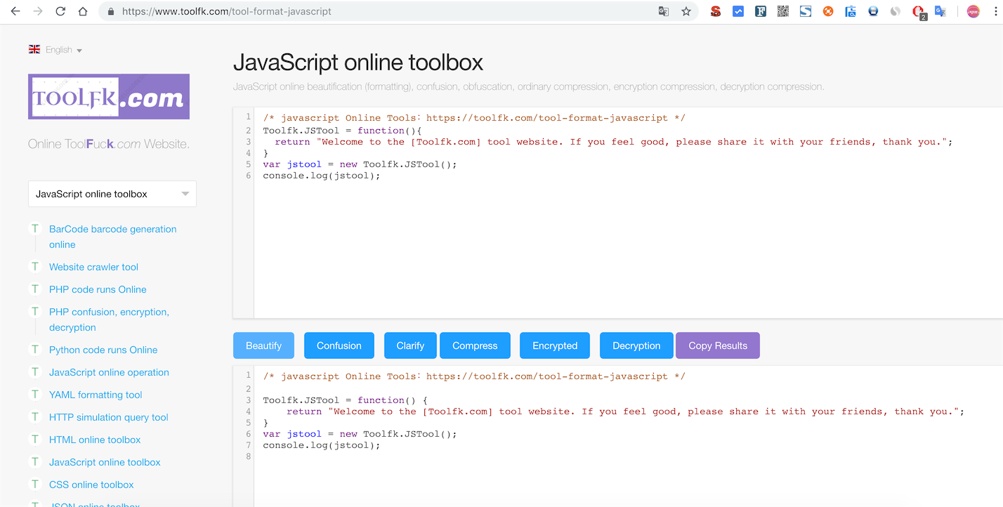 1 | This paper to recommend \[ToolFk\] is a programmers often use a free online test kit, ToolFk feature is focused on everyday programmer development tools, without having to install any software, as long as the content execution affixed by a button, able to obtain the contents of the desired results.ToolFk also supports [BarCode Barcode generated online ](https://www.toolfk.com/tool-generator-barcode "BarCode Barcode generated online"), [QueryList collector ](https://www.toolfk.com/tool-run-reptile "QueryList collector"), [PHP code is run online ](https://www.toolfk.com/tool-online-runphp "PHP code online operation"), [PHP confusion, encryption, decryption ](https://www.toolfk.com/tool-convert-php "PHP confusion, encryption, decryption"), [Python code is run online ](https://www.toolfk.com/tool-online-runpython "Python code runs online"), [JavaScript online operation ](https://www.toolfk.com/tool-online-runjs "JavaScript online operation"),[YAML formatting tools](https://www.toolfk.com/tool-format-yaml "YAML formatting tools") , [HTTP simulation query tool ](https://www.toolfk.com/tool-online-http "HTTP query tool simulation"), [HTML online toolbox ](https://www.toolfk.com/tool-format-html "HTML Online Toolbox"), [JavaScript online Toolbox ](https://www.toolfk.com/tool-format-javascript "JavaScript toolkit online"),[CSS online toolbox ](https://www.toolfk.com/tool-format-css "CSS Online Toolbox"), [JSON online toolbox ](https://www.toolfk.com/tool-format-json "JSON Online Toolbox"), [unixtime timestamp conversion ](https://www.toolfk.com/tool-convert-unixtime "Unixtime timestamp conversion"), [Base64 / the URL of / native2ascii conversion ](https://www.toolfk.com/tool-encdec-transform "Base64 / URL / Native2Ascii conversion"), [CSV conversion kit ](https://www.toolfk.com/tool-convert-csv "CSV Converter Toolkit"), [XML online toolbox ](https://www.toolfk.com/tool-format-xml "XML Online Toolbox"), [the WebSocket online tools ](https://www.toolfk.com/tool-online-runwebsocket "WebSocket online tools"), [Markdown online toolbox ](https://www.toolfk.com/tool-convert-markdown "Markdown Online Toolbox"), [Htaccess2nginx conversion](https://www.toolfk.com/tool-convert-htaccess2nginx "Htaccess2nginx conversion"), [Hex conversion online ](https://www.toolfk.com/tool-convert-hexadecimal "Online hex conversion"), [online encryption toolkit ](https://www.toolfk.com/tool-convert-encryption "Online Encryption Toolkit"),[online pseudo-original tools ](https://www.toolfk.com/tool-convert-text "Online pseudo-original tool"), [online APK decompile ](https://www.toolfk.com/tool-decompile-apk "Online APK decompile"), [online web screenshot tool ](https://www.toolfk.com/tool-screen-captures "Online web screenshot tool"), [online random password generation ](https://www.toolfk.com/tool-password-generator "Online Random Password Generator"), [online generate two-dimensional code qrcode ](https://www.toolfk.com/tool-generate-qrcode "Online generated two-dimensional code Qrcode"), [online Crontab Expression Builder ](https://www.toolfk.com/tool-generate-crontab "Online Crontab Expression Builder"),[the online short URL Generator ](https://www.toolfk.com/tool-short-url "Online Short URL Generator"), [Online calculator tool](https://www.toolfk.com/tool-game-calculator "Online calculator tool") , [Linux common commands Daquan](https://www.toolfk.com/tool-find-linux "https://www.toolfk.com/tool-find-linux") , [online text comparison tool](https://www.toolfk.com/tool-online-difftext "https://www.toolfk.com/tool-online-difftext") , [online mind mapping tools](https://www.toolfk.com/tool-online-mind "https://www.toolfk.com/tool-online-mind") , [online database design tool](https://www.toolfk.com/tool-online-designer "https://www.toolfk.com/tool-online-designer") , [free CDN acceleration service](https://www.toolfk.com/tool-online-cdnjs "https://www.toolfk.com/tool-online-cdnjs") , [online stress test tool](https://www.toolfk.com/tool-online-bench "https://www.toolfk.com/tool-online-bench") , [map coordinates pick up tools](https://www.toolfk.com/tool-online-map "https://www.toolfk.com/tool-online-map") , [online SQL conversion tool ](https://www.toolfk.com/tool-convert-sql "https://www.toolfk.com/tool-convert-sql"). And more than 20 daily programmer development tools, can be considered a very comprehensive website programmer's toolbox.