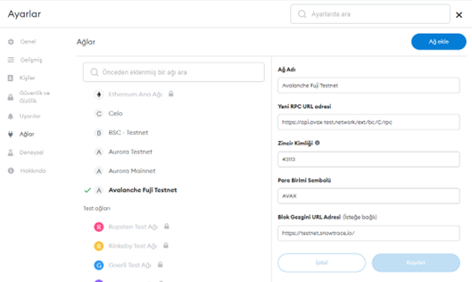 15 |Metamask cüzdanınızı tarayıcınızın eklentiler kısmından indirebilirsiniz. Metamask cüzdanını kurduğunuzu varsayarak "Ağ Ekle" kısmından Avalanche'ın testneti olan "Fuji Testnet" ağını aşağıdaki bilgileri girerek ekliyoruz. Bu proje sürecinde Fuji testnetin cüzdanlarını kullanacağız ve kontratları bu ağa deploy edeceğiz. Kısaca Fuji ve testnet hakkında bilgi vermem gerekirse;