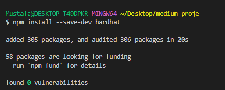 npm install --save-dev hardhat ile hardhati projemize indiriyoruz.