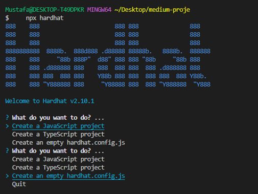 npx hardhat ile Hardhati çalıştırarak çalışma ortamının kurulmasını sağlıyoruz.