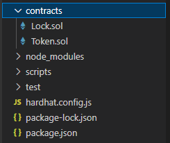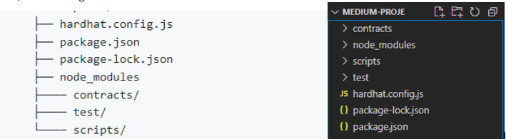 Dosya yapısı aşağıdaki gibi olması gerekmektedir. O yüzden “contracts,test,scripts” dosyalarını hardhat proje dizininin içerisine biz oluşturuyoruz.