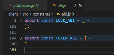375 | 376 | ``` 377 | import { ethers } from 'ethers'; 378 | import './App.css'; 379 | import {useLockContract } from './hooks/useLooksContract'; 380 | 381 | function App() { 382 | const lockContract = useLockContract 383 | 384 | ``` 385 | 386 | 387 | 388 | •const lockContract = useLockContract().