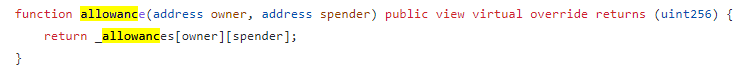 501 |Kısacası bu fonksiyon hangi token sahibinin hangi adreslere ödeme hakkı(approve) verdiyse, o ödeme miktarından kalan değeri verir.