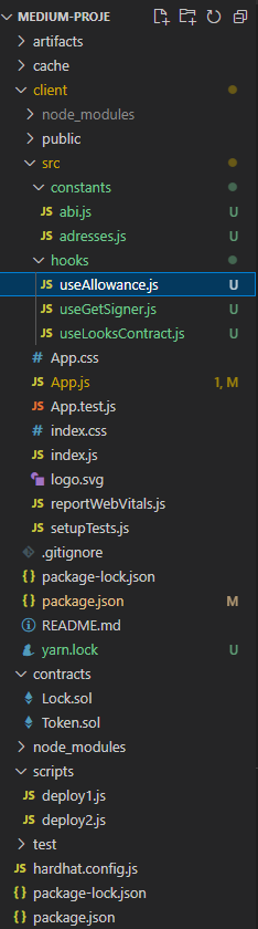 265 | 266 | Hardhat proje dosyamızın ana dizinine react projemizi oluşturuyoruz. Oluşturduğumuzda projemizin dosya görünümü aşağıdaki gibi olacaktır. 267 |