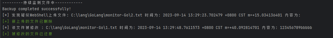 158 | fmt.Println("[*] 该文件被修改 :", filePath, "时间为:", time.Now(), "内容为:", content)