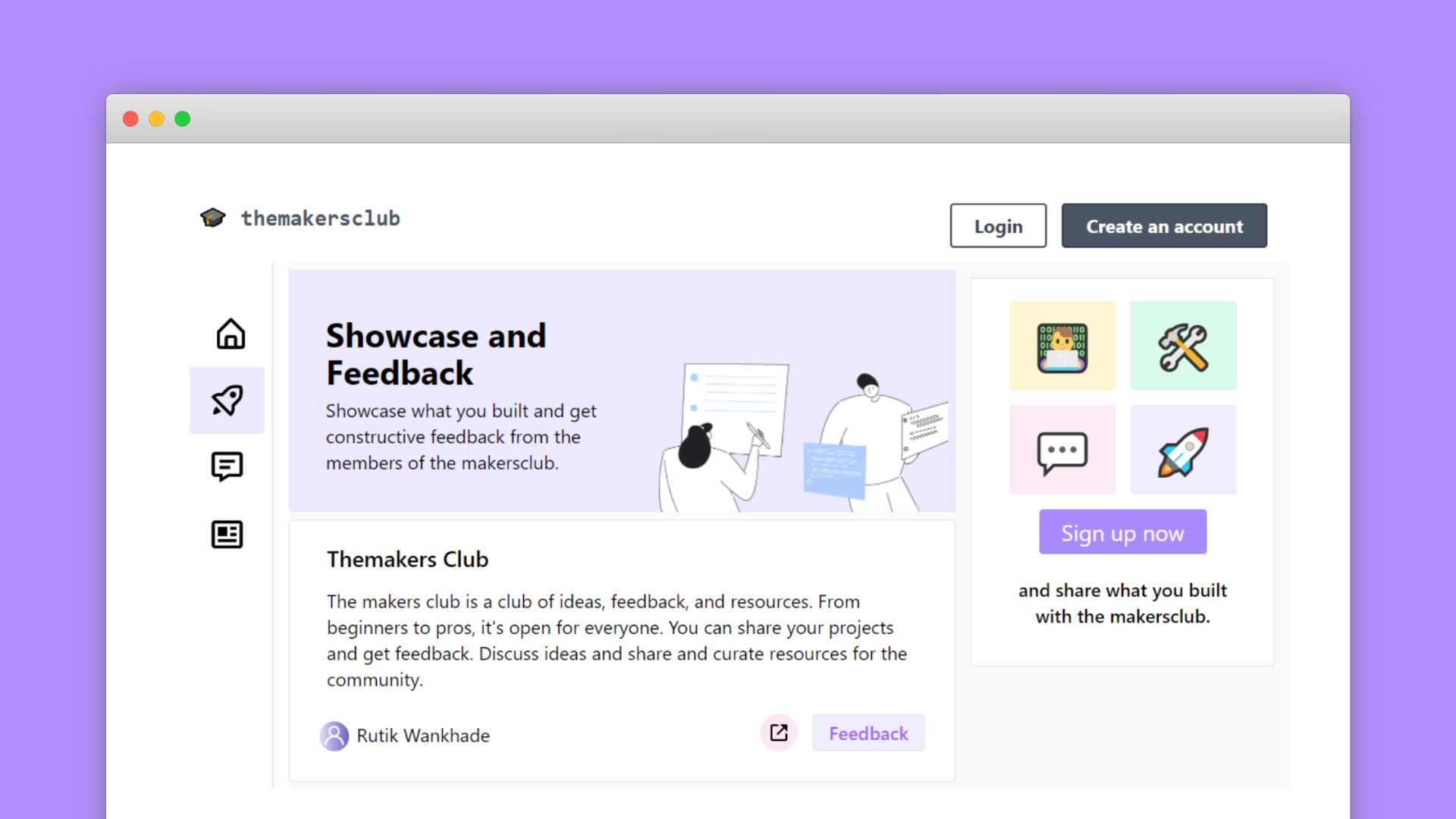 50 | 51 | 52 |Showcase what you built and get constructive feedback from the members of the makersclub.