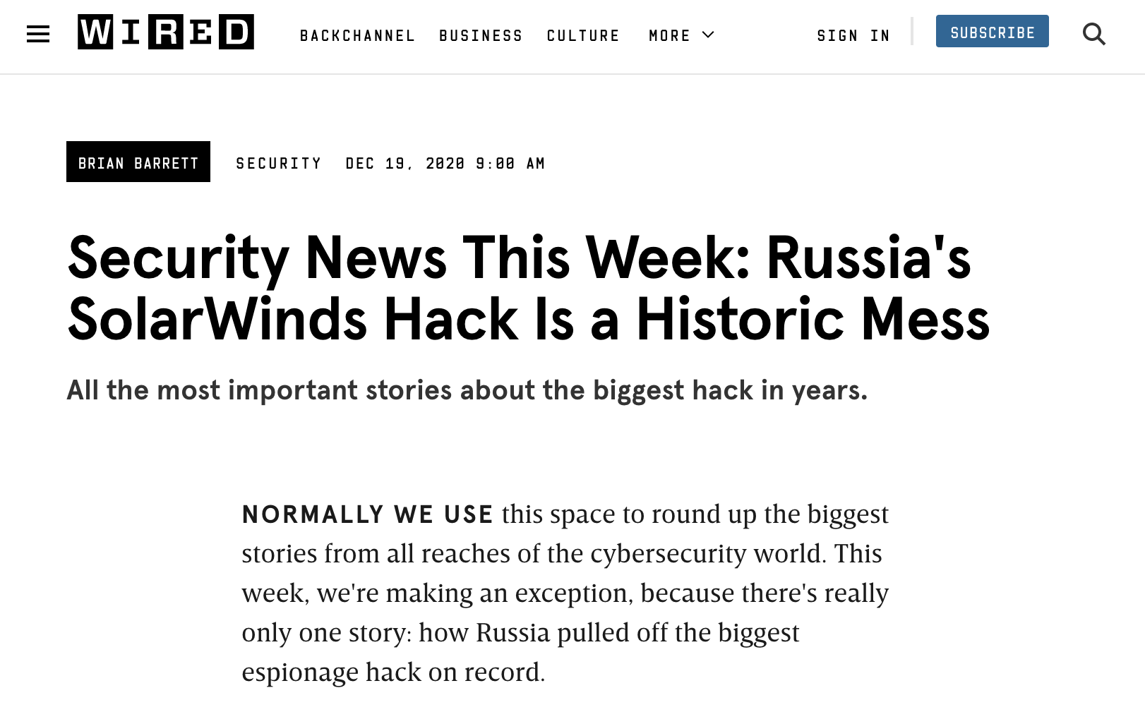 351 | - [Solarwinds](https://www.wired.com/story/russia-solarwinds-hack-roundup/) ([non-paywalled link](https://archive.md/3RizK))