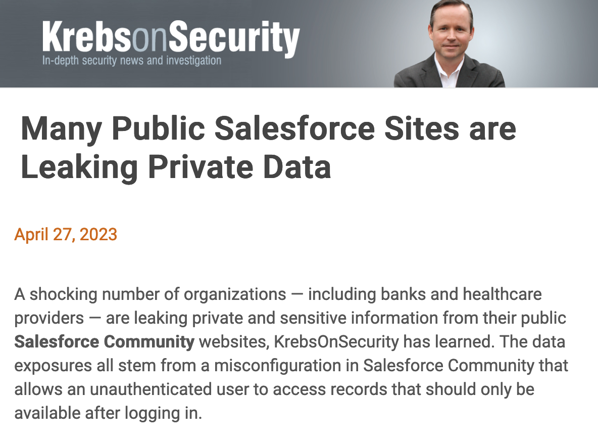 348 | - [Salesforce public sites](https://krebsonsecurity.com/2023/04/many-public-salesforce-sites-are-leaking-private-data/)
