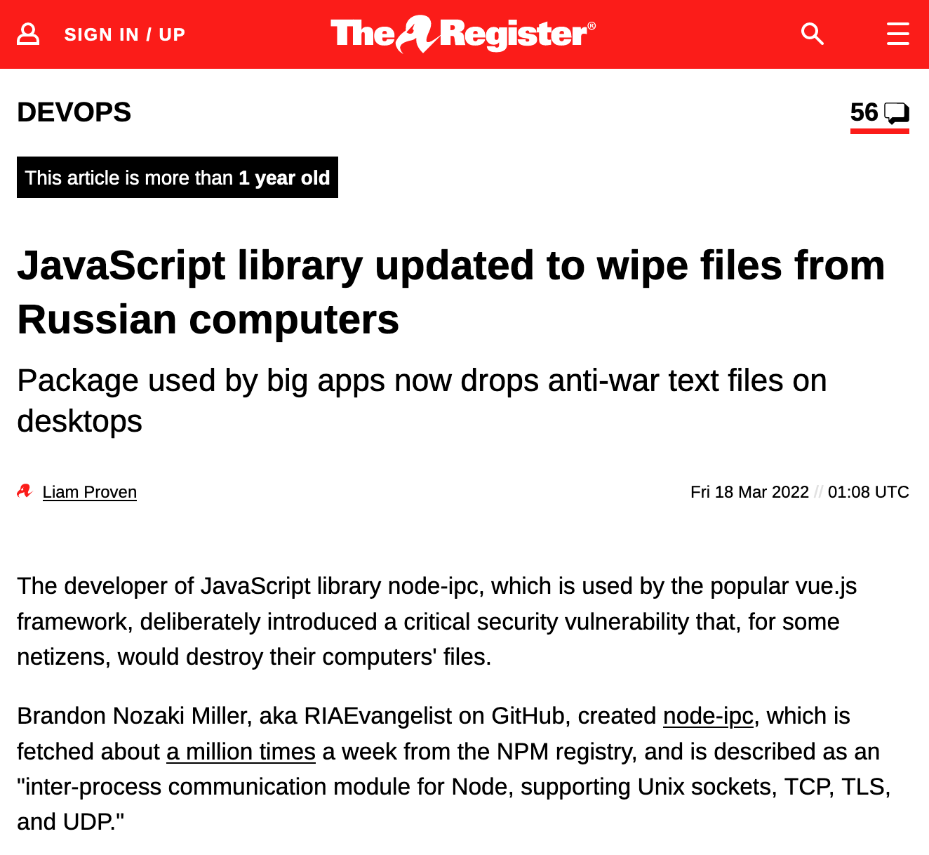 349 | - [node-ipc updated to support Ukraine](https://www.theregister.com/2022/03/18/protestware_javascript_node_ipc/)