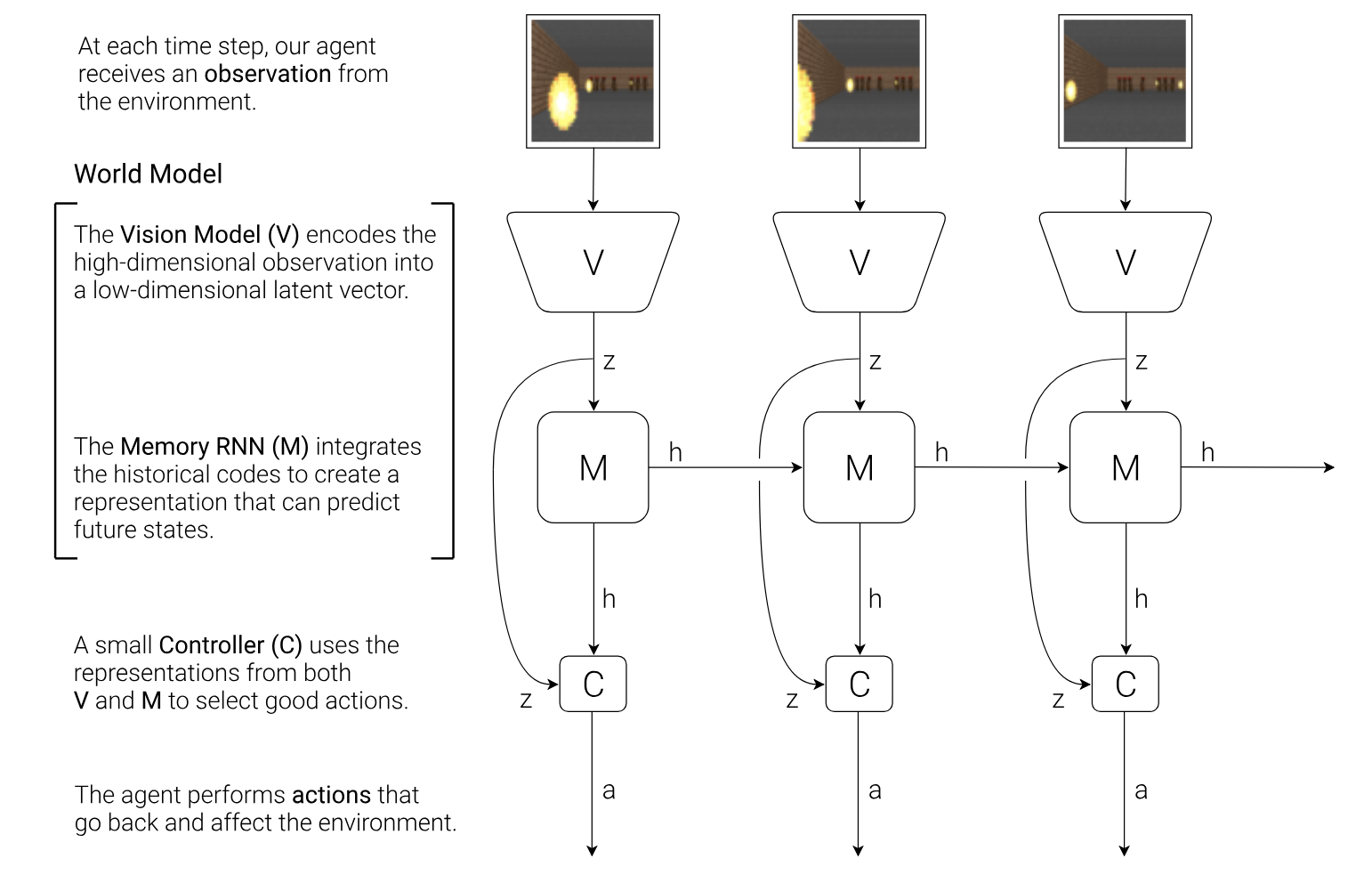 42 | I think the paper is well-presented and shows lots of cool findings. However, it's obvious that unsupervised learning of V and M cannot learn really compact features for the downstream specific task that C is addressing since there is no reward. If we can backprop the reward signal back to both V and M then this issue is solved but then the problem is not simplified compared to deep learning anyway.